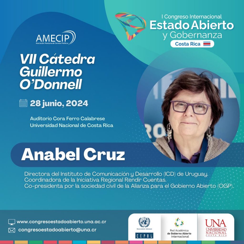 En la sesión de este año, la Cátedra principal estará a cargo de Anabel Cruz, Directora del Instituto de Comunicación y Desarrollo (ICD) de Uruguay, Coordinadora de la Iniciativa Regional Rendir Cuentas, y Co-presidenta por la sociedad civil de la Alianza para el Gobierno Abierto (OGP).