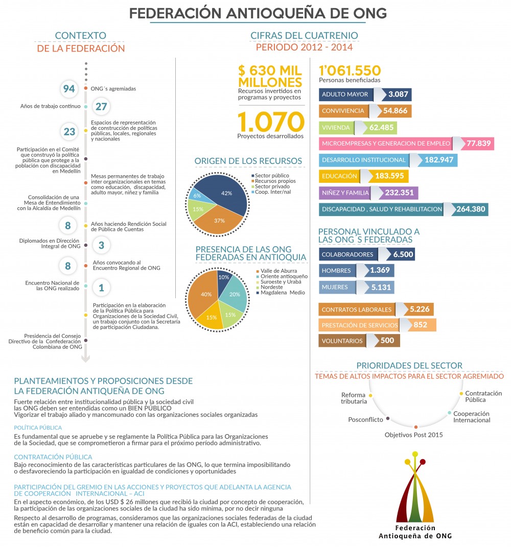 El propósito desde la la Asociación de ONG de Antioquia (Colombia) es que cada día más entidades del sector social organizado le apueste a informar a la sociedad civil acerca de las actuaciones, progresos y desarrollo alcanzados desde la gestión de las entidades federadas. Es por eso que ofrecen una información consolidada del periodo comprendido entre 2012 y 2014.
