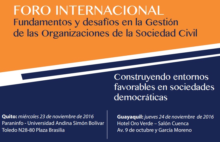 El 23 y 24 de noviembre de 2016 tendrá lugar en Ecuador el Foro Internacional “Fundamentos y desafíos en la Gestión de las Organizaciones de la Sociedad Civil, Construyendo entornos favorables en sociedades democráticas”.