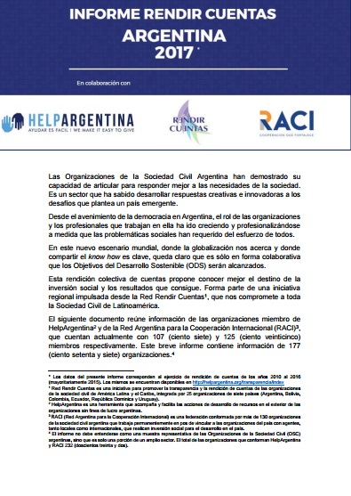 En 2017 Help Argentina y RACI, la Red Argentina para Cooperación Internacional, realizaron por primera vez una rendición colectiva de cuentas de organizaciones de la sociedad civil Argentina. Su objetivo es que este ejercicio sea el puntapié inicial de una práctica habitual y cada vez más inclusiva.