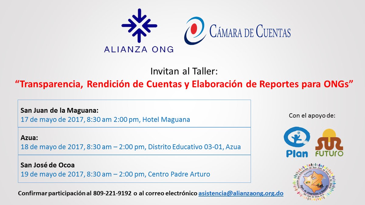 Alianza ONG, organización socia de Rendir Cuentas, realizó el “Taller Transparencia, Rendición de Cuentas y Elaboración de Reportes para Organizaciones No Gubernamentales (ONG)” en Santiago Rodríguez, República Dominicana. La actividad cuenta con el auspicio de la Cámara de Cuentas de la República Dominicana (CC). El taller tuvo como fin orientar a las […]