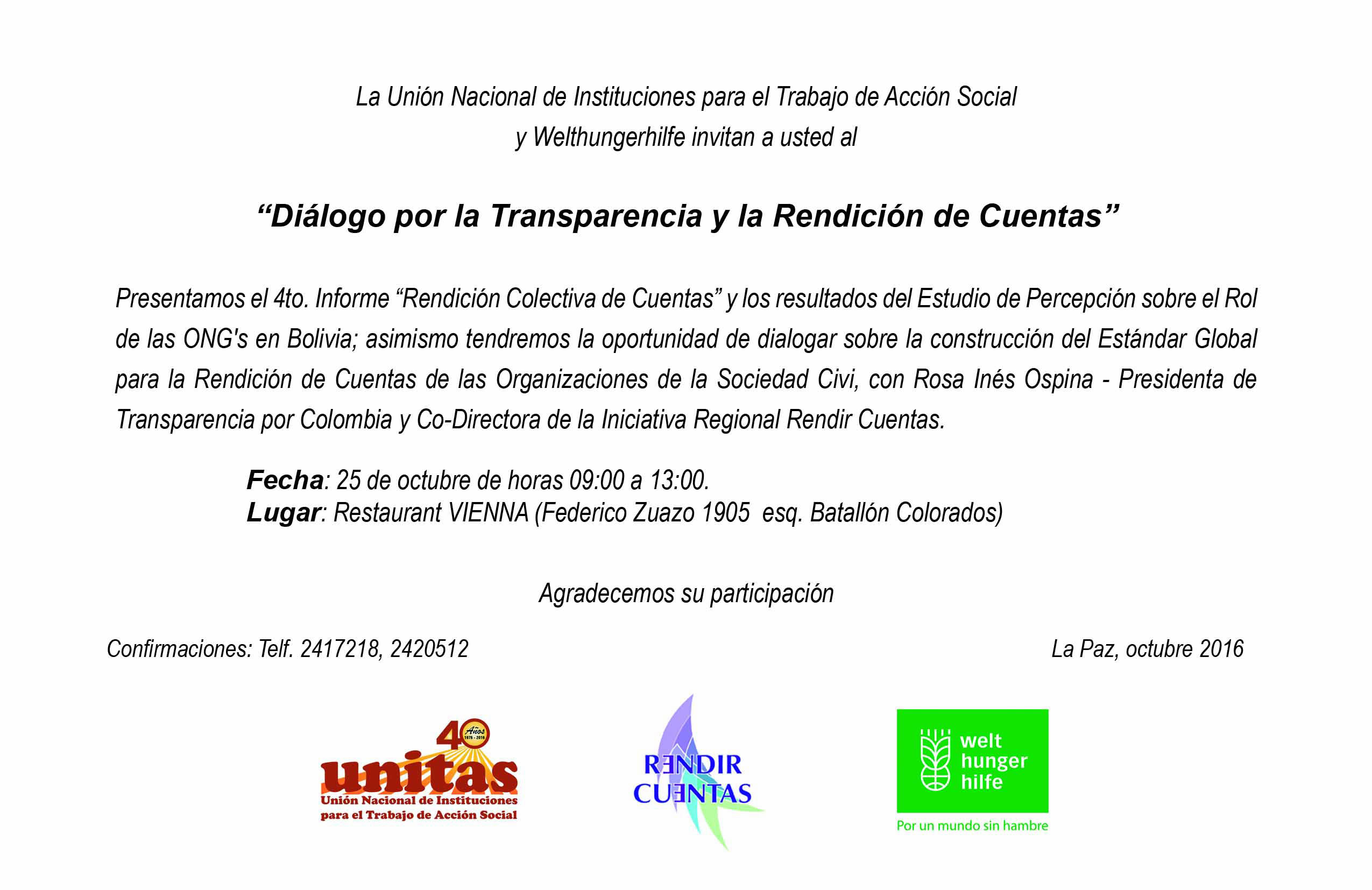 El próximo 25 de octubre, la Unión Nacional de Instituciones para el Trabajo de Acción Social de Bolivia, junto a Rendir Cuentas y a Welthungerhilfe presenta el cuarto informe “Rendición colectiva de cuentas”. Artículos relacionados: Bolivia: rendición colectiva de cuentas Informe colectivo UNITAS 2012 Van por otra