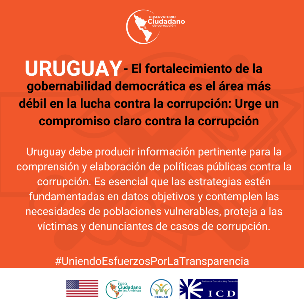 Este día, el Instituto de Comunicación y Desarrollo (ICD), la Coordinación Nacional del OCC y punto focal del Foro Ciudadano de las América (FCA) y CAinfo, el Colectivo Trans del Uruguay (CTU), DATA Uruguay, Grupo Visión Nocturna, el Instituto Afrodescendiente-Uruguay, IELSUR, MYSU, DITEC y la Fundación Siembra, organizaciones integrantes del Observatorio Ciudadano de Corrupción (OCC), y vinculadas a la Red Latinoamericana y del Caribe por la Democracia (Redlad), presentan los resultados del Informe de seguimiento al cumplimiento de los compromisos asumidos por Uruguay en las Cumbres de las Américas Lima (2018) y Los Ángeles (2022).