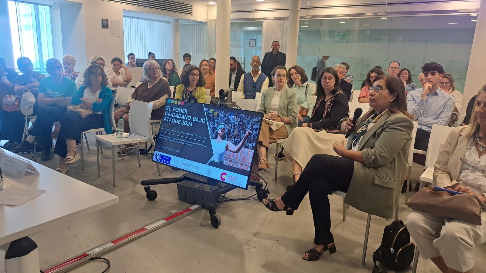 Inés Pousadela (Investigadora principal, CIVICUS) Julieta Zubbrigg (Asesora de investigación, CIVICUS Monitor) y Analía Bettoni (Coordinadora de proyectos, ICD Uruguay) presentaron el informe El poder ciudadano bajo ataque 2024 realizado por el CIVICUS Monitor, así como las tendencias mundiales y regionales en la reducción del espacio cívico. El informe documenta cientos de casos de ataques contra activistas y periodistas en la región y en su edición 2024, constató que 25 de los 35 países de las Américas restringen severamente las libertades cívicas. Sobre este punto, Inés Pousadela, agregó que “la sociedad civil es objeto de restricciones que no vienen solo de fuentes estatales sino de actores no estatales. Una de las tendencias a largo plazo que se observan es que estas ultimas se encuentran en aumento. Poco más del 2% de la población del mundo vive en países con espacio cívico, catalogado según el CIVICUS Monitor, como abierto”.
