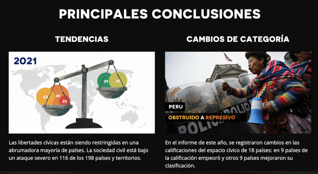 El informe “El poder ciudadano bajo ataque 2024” identifica las principales tendencias mundiales y regionales en el espacio cívico y cubre el periodo comprendido entre el 1 de noviembre de 2023 y el 31 de octubre de 2024. En este lapso, CIVICUS Monitor identificó más de 2500 casos en los que se violaron las libertades cívicas. Mediante el uso de etiquetas se detectaron las tácticas de represión más comunes en todo el mundo, se destacan las violaciones que ejemplifican los retos específicos a los que se enfrenta cada región y se explica cómo se está restringiendo el espacio cívico.