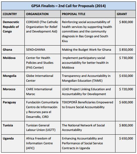 La Alianza Global para la Auditoría Social (GPSA) ha anunciado la selección y aprobación de ocho nuevos proyectos en Ghana, Uganda, Moldova, República Democrática del Congo, Marruecos, Mongolia, Paraguay y Túnez, como resultados del segundo llamado del GPSA, al que se presentaron más de 400 proyectos. Las donaciones totalizan más de 6 millones de dólares para proyectos que se desarrollarán en los próximos 5 años y en los que la sociedad civil y los gobiernos cooperarán para resolver temas críticos de gobernanza en países en desarolllo.