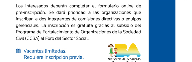 Dirigido a: miembros de comisiones directivas, staff gerencial y técnico y líderes y asesores de organizaciones con fines sociales que participen en la gestión institucional. La inscripción es gratuita.y se priorizarán las postulaciones que realicen equipos de 2 integrantes de la misma organización.