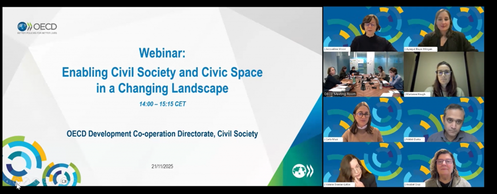 | El 21 de noviembre de 2025, la Dirección de Cooperación al Desarrollo de la OCDE organizó el webinar: “Promover a la sociedad civil y el espacio cívico en un escenario cambiante (Enabling Civil Society and Civic Space in a Changing Landscape)”.